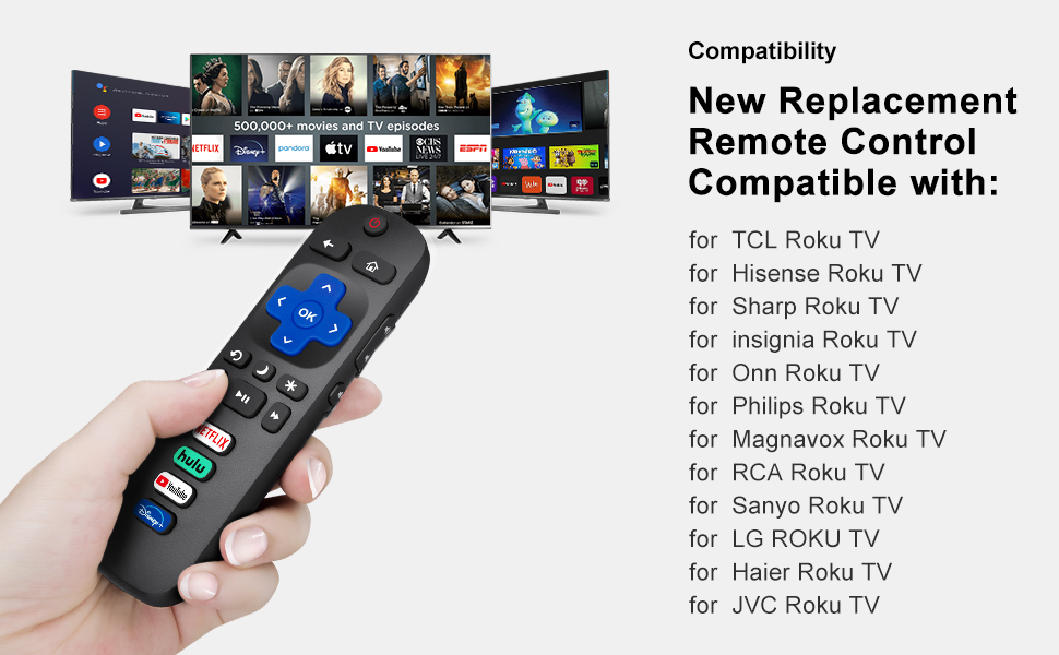 • EXACT COMPATIBILITY: Universal Replacement TV Remote Compatible with TCL Roku, Hisense Roku, Onn Roku, Sharp Roku, Element Roku, Westinghouse Roku, Philips Roku, Insignia Roku, JVC Roku, RCA Roku and Sanyo Roku TVs.