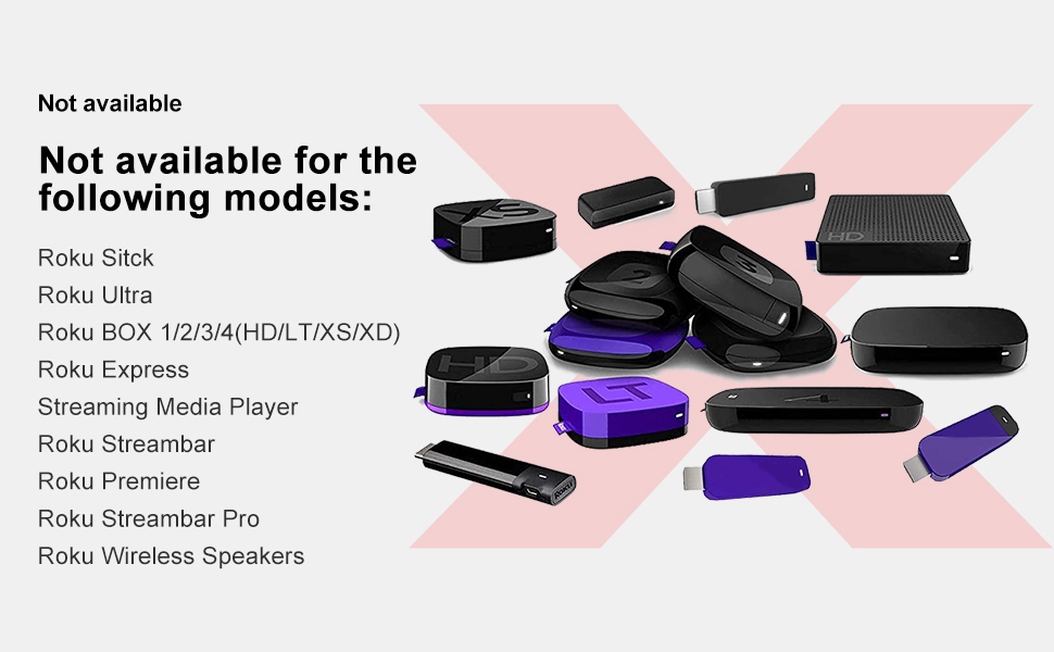 • NOT APPLICABLE: TV Remote is NOT Compatible with Roku Stick, Roku Streaming Stick, Roku Box 1/2/3/4(HD/LT/XS/XD), Roku Ultra, Roku Express, Roku Premiere or Roku Player.